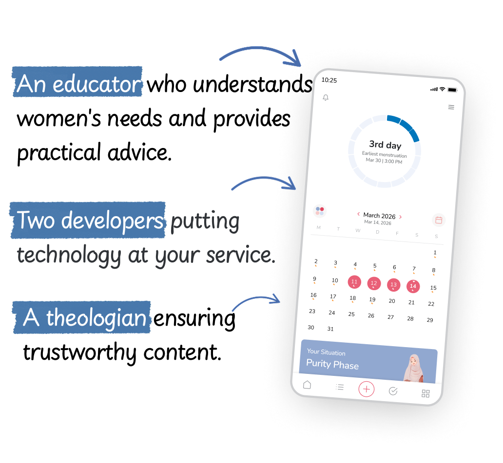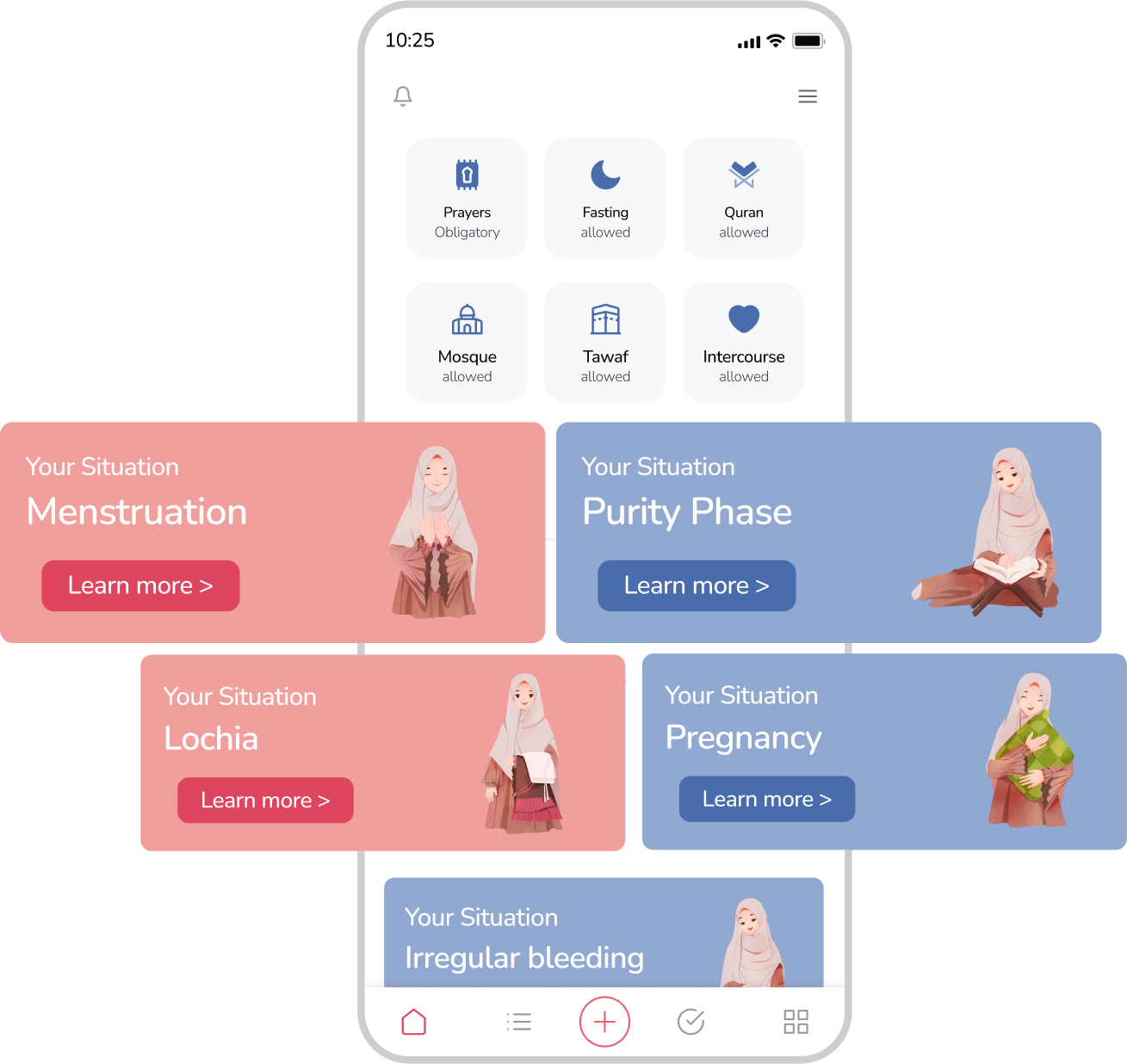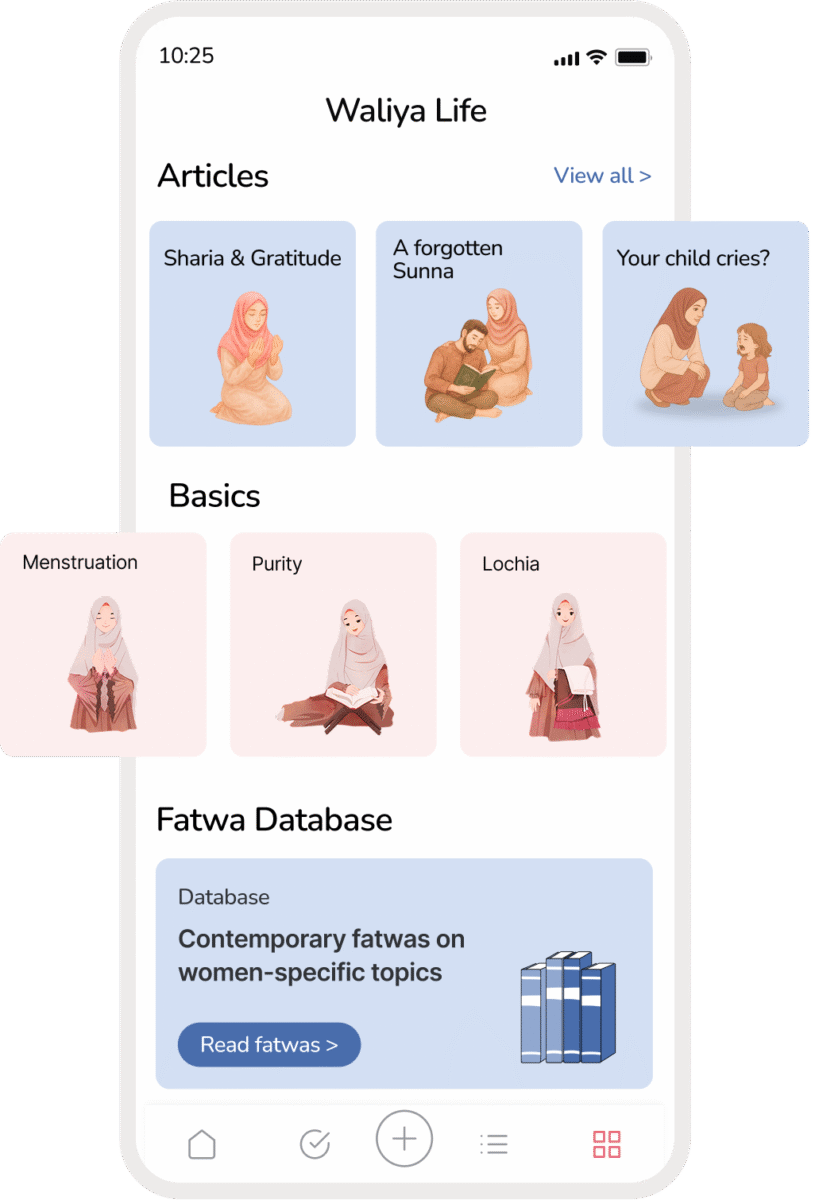 Waliya helps you track your menstruation, purity phases, and postpartum bleeding, calculate and organize missed prayers and fasts, access fatwas and articles, and find the Qibla.